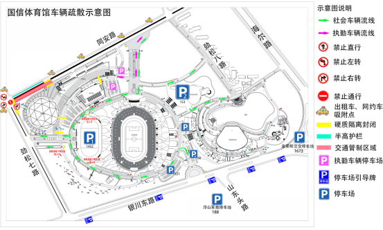 2、国信体育中心各大门外禁止所有车辆停放,尤其是同安路(劲松七路至劲松八路段)、银川东路(劲松七路至山东头路)、劲松七路(银川东路至同安路段),确保散场时通道畅通。