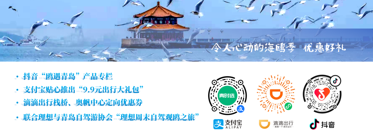 在抖音开通#鸥遇青岛产品专栏,涵盖景区、酒店等特别优惠;支付宝“9.9元享1000元海鸥季大礼包”;滴滴打车发出6折观鸥打车优惠券;还有自驾的朋友,理想汽车、自驾游协会将开启“理想周末自驾观鸥之旅”,同时,联动霸王茶姬、吕氏疙瘩汤、虎邦辣酱、凯菲食品等知名品牌推出限定联名产品,西海岸农高集团等企业平台也将带来“鸥味”美食体验,聚力产业联动,推动“海鸥+”模式向可持续产业生态体演进,实现从“季节性活动”到“全时域产业”的质变。