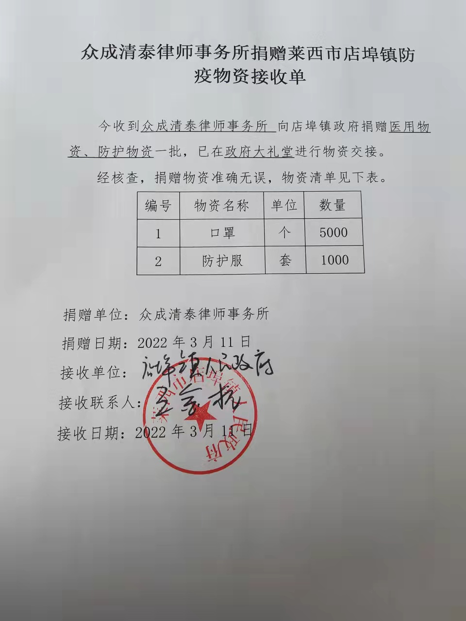 3月10日,致公党青岛市委会监督委员会副主任、众成清泰(青岛)律师事务所主任林杨同志购买医用防护服1000套、N95口罩5000只,并于次日上午将物资捐赠给了莱西市店埠镇抗疫指挥部。