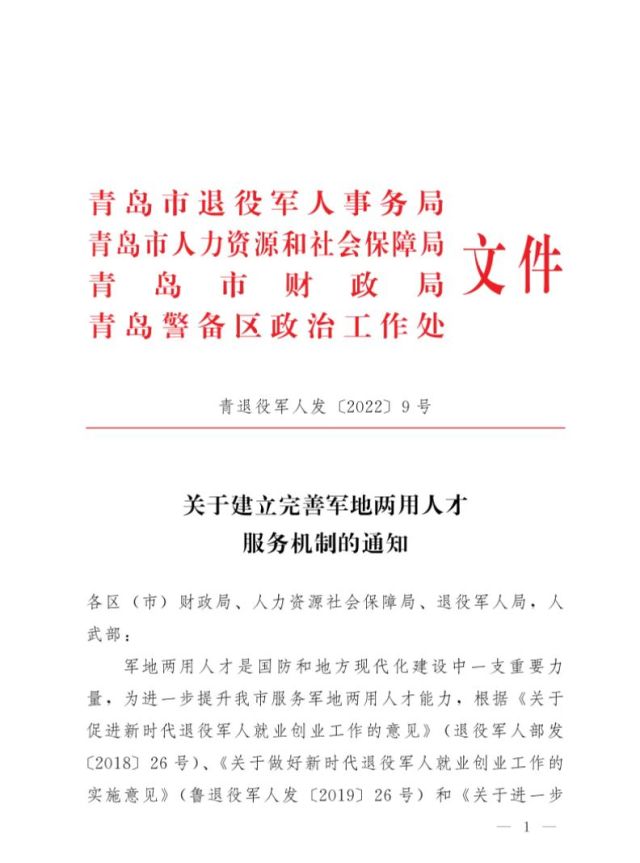 近日,青岛市退役军人局、市人力资源社会保障局、市财政局和青岛警备区政治工作处联合印发《关于建立完善军地两用人才服务机制的通知》,出台14项举措,按照“自愿选择、政府推动、市场主导”原则,打造“就业有岗位、创业有扶持”的军地两用人才服务机制,为广大退役军人就业创业搭建更加广阔的发展平台。