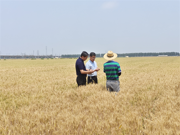 (农技专家察看麦田成熟情况引导农户做好收割期预判)