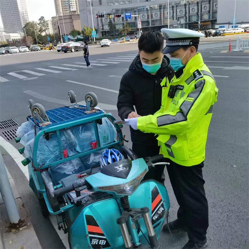 在电动车违法行为专项整治行动中,上午10时许,遇到一外卖骑手刘某在山东路路口上了机动车道,经询问由于着急送餐选择了抄近路,交警当场对其进行批评教育,并依法处以50元罚款;10时40分,在山东路与香港中路路口,遇到一送水三轮车未取得备案登记牌照就上路行驶,交警将其拦下并依法给予处罚;11时在山东路与香港中路路口查处一驾驶人未佩戴安全头盔行为,交警看到车上有头盔询问驾驶员为何不戴头盔,驾驶人声称头盔太小戴不上,在交警的主动劝说下,驾驶员说尽快买好一顶合适的头盔,并确保上路即戴头盔。
