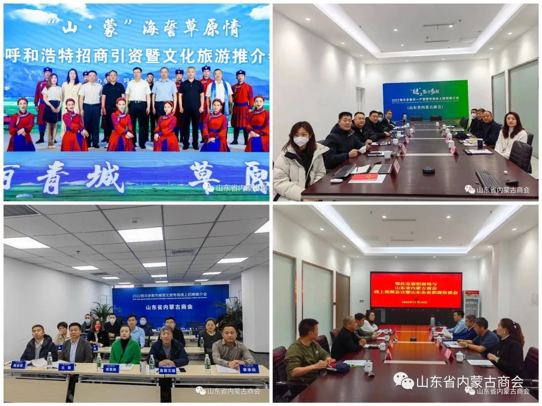 近两年来,先后助力并参加内蒙古自治区(青岛市)招商引资推介会,呼和浩特(青岛)企业家恳谈会,呼和浩特招商引资暨文化旅游推介会,鄂尔多斯市一产重塑专场、商贸文旅专场线上招商推介会等数十场家乡各盟市招商引资推介会,组织参会企业100余家。回乡考察共50余次,带领企业家考察近300余人,意向投资600亿元。商会目前设有内蒙古自治区总商会山东省联络处、内蒙古自治区农牧业产业化龙头企业协会山东办事处、呼和浩特市招商引资青岛联络处、包头市人民政府山东省招商引资联络处、鄂尔多斯市驻山东招商联络处等多个招商联络处及办事处,并且已与自治区多个盟市签订了委托招商协议。