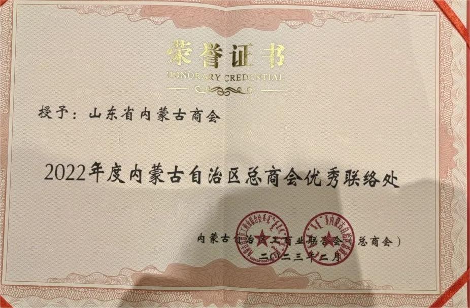 山东省内蒙古商会被授予“2022年度内蒙古自治区总商会优秀联络处”荣誉称号