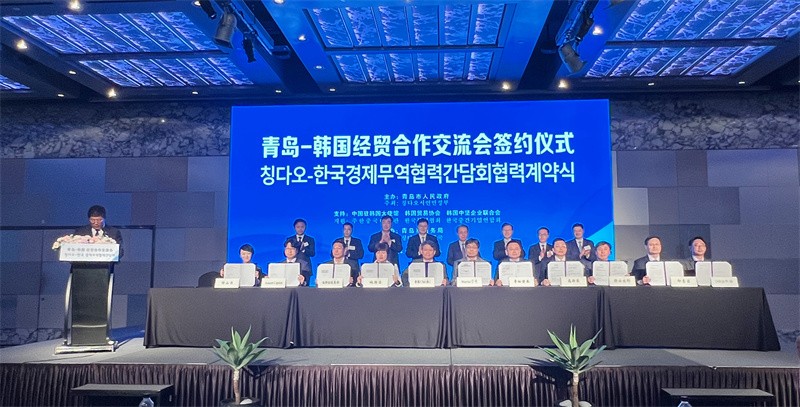 此前的4月11日,青岛市政府在韩国首尔举行“青岛——韩国经贸合作交流会”,这是中国疫情防控措施优化调整后,青岛市政府在海外举办的首场经贸活动。韩国现代、GS、SK、希杰、晓星钢帘线、新都理光、锦湖等企业,韩国贸易协会、韩国中坚企业联合会等主要经济机构及商协会,以及新韩银行、韩亚银行等金融及咨询机构,釜山、大邱、仁川等韩国城市的代表近300人参加了交流会。涉及汽车配件、生物医药、现代商贸、证券金融、现代农业等领域的11个合作项目进行了现场签约,13个入驻K茂的项目进行了集中签约,交流合作成果颇丰。