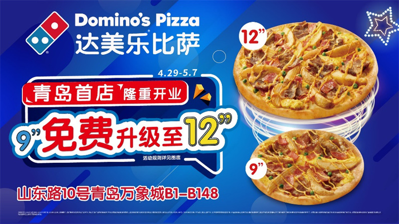 随着此次青岛首店的启幕,达美乐比萨中国还特别为顾客准备了开业惊喜!开业活动期间即2023年4月29日起至2023年5月7日,在青岛万象城店购买任意系列9”比萨可免费升级至同款12”(即原价购买任意系列12”比萨均以同款9”比萨价格结算),12”比萨39元起,30余款比萨随心选!(自取、堂食均可参与,具体活动规则请详询门店)。开业活动期间,在青岛万象城店,顾客单笔订单消费实际金额满128元还赠送青岛城市限定文创帆布包,数量有限(共1000个),送完即止,先到先得。