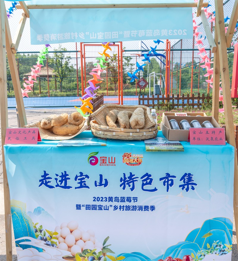 活动期间,宝山镇精心打造“走进宝山”特色市集,“宝山剪纸”“宝山地秧歌”等非遗文化产品,宝山玉、丝瓜瓤、葫芦瓢等本土特色工艺品传承技艺;蓝莓黄金素、蓝莓酵素、蓝莓酒、蓝莓果酱、蓝莓果干、蓝莓蜂蜜等深加工产品健康时尚;庄户面粉、林子野茶、杨家辣酱、晾制瓜枣、滕家粉条、土鸡蛋等“土特产”乡味十足……市集设置宝山文化、蓝莓产品、乡土特产等展区,通过不同的新场景让更多的人了解和分享到宝山镇乡村振兴的成果。