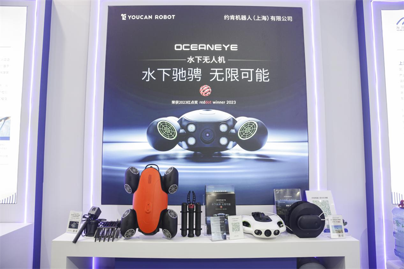 无人机能在天上飞,这并不稀奇,但你见过能在水里游的无人机吗?本次海博会上,约肯机器人(上海)有限公司就带来了两款水下无人机。据企业销售主管王琴介绍,企业的消费级产品是全球首款变焦拍摄水下无人机,可用于水产养殖、潜点探测、水下勘察等,可进行画面实时传输,例如在海参养殖过程中,就可以利用它实现随时监测,取代潜水员工作。工业级产品则是全球首款轻工业级3D全域运动水下无人机,功能和应用更广泛,可以实现水下全景域视角拍摄,360度全维度自由运动,并能搭载机械臂、声呐、采水器等,实现水下灵活作业。