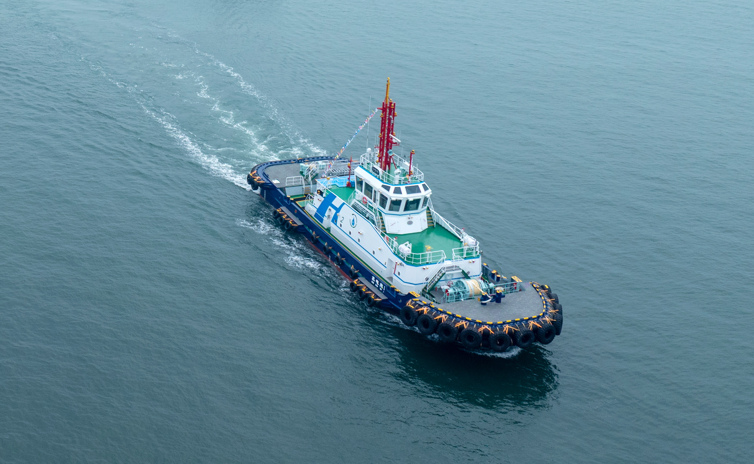 该拖轮搭载创新的“氢燃料电池+液冷锂电池”混动系统,可实现真正意义上的零碳排放,在9节航速下续航超12小时,拖力达82吨。其创新应用北斗集成系统、全自动智能岸基充电等先进技术,攻克多项国内技术空白,成为全国马力最大、锂电池容量最大的港作拖轮,并获得电推船舶AUT-0附加标志。与传统燃油拖轮相比,“氢电拖1”轮在噪音控制、设备寿命、能源利用效率等方面优势显著,将大幅降低港口作业碳排放。据测算,该轮投产后,预计每年可减少二氧化碳排放1500余吨。山东港口青岛港轮驳公司张雷表示:“从项目立项到建成,我们攻克了无数技术难关,如今它的投入使用,将有力推动港口作业大幅降低碳排放,加速整个港口向绿色、智能化方向迈进。”