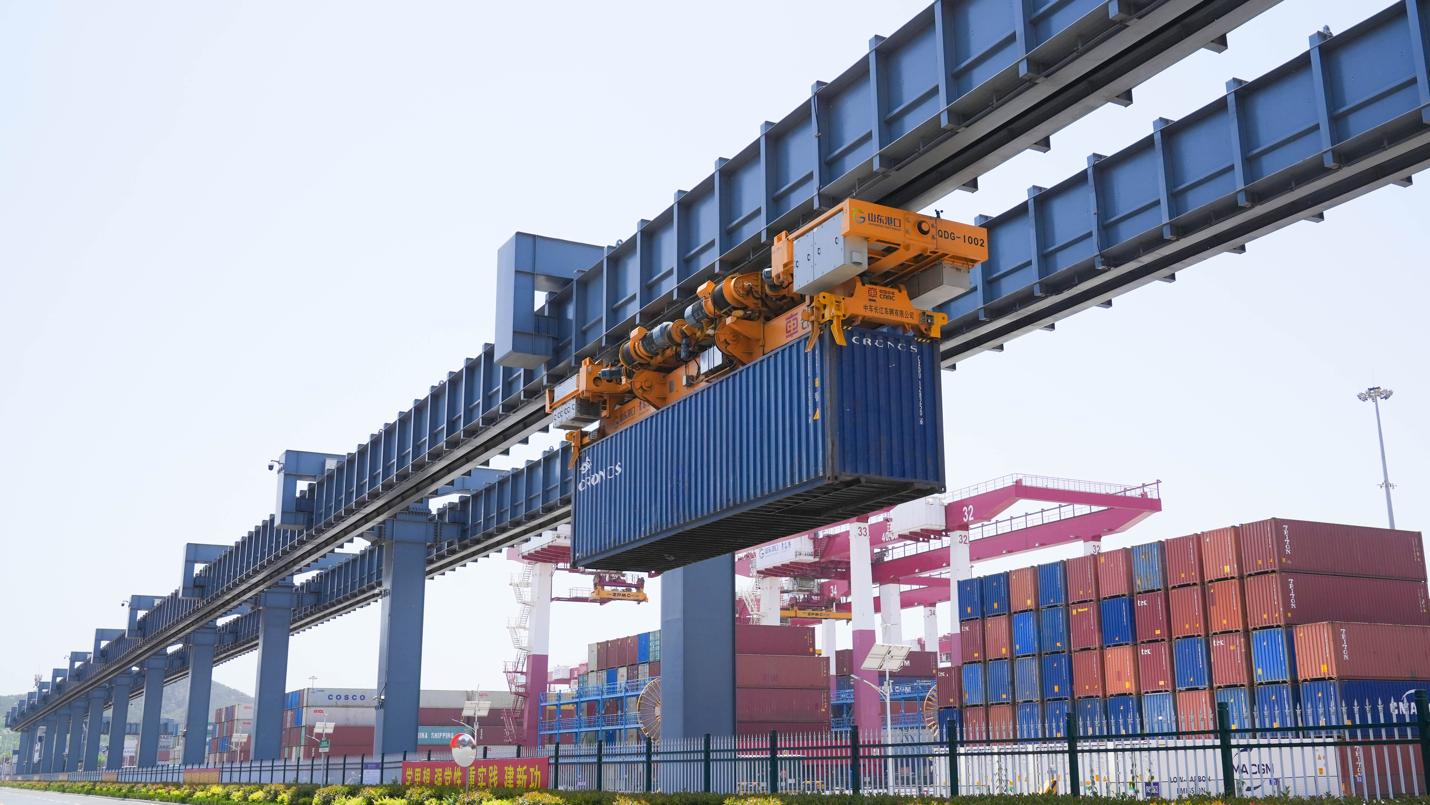 作为青岛港集装箱运输的重点港区,前湾集装箱南港区包括两个连片码头(QQCTU、QQCTN),以外贸集装箱干线运输为主,通过航线统一部署、船舶统一调配、泊位资源共享,大幅缩短船舶在港时间;深化“区关港航”协同联动,实现水水中转全程通关自动化,整个物流链条作业效率同比提高30%。绿色装备应用方面,油电拖轮、氢电拖轮投入使用,为港区提供绿色靠离泊服务;全球首创空轨集疏运系统,实现集装箱清洁运输和跨区域联动;自主研发“集装箱码头智能管控系统(A-TOS)”,深度融合智慧化、绿色化,连续刷新自动化码头装卸效率世界纪录。