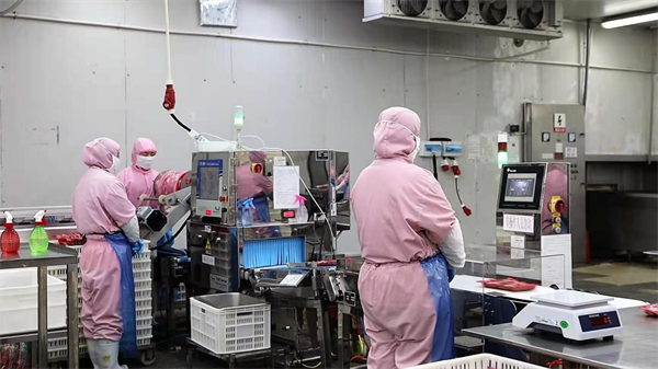 日前,在青岛莱西市的青岛新万福食品有限公司肉联厂门口,一辆辆白色货车在接受两侧消杀雾炮机的全面消毒后,缓缓驶入厂内产品装载区,紧接