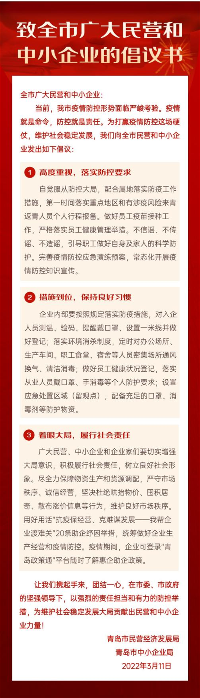 为认真贯彻落实中央和省、市委的部署要求,青岛市民营经济发展局立足职能,多措并举、多方聚力,号召和带领青岛市民营中小企业共同携手抗疫