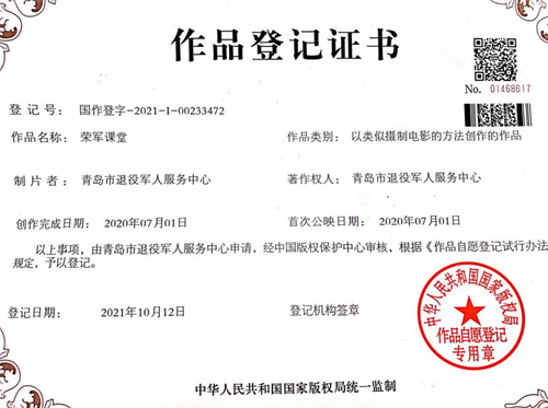 2021年10月13日,荣军课堂成功完成中国版权作品登记。据了解,退役军人思想政治教育题材作品申请完成版权登记,青岛市退役军人事务局是国内